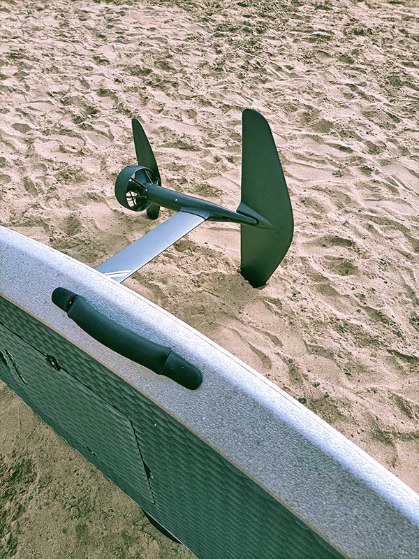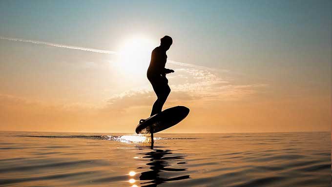 An E-foil is a surfboard with an electric propeller just above the wing of the hydrofoil, which powers the board to move through any water. The E-foil is powered by a nearly silent electric motor and rechargeable battery. It’s controlled by a handheld wireless remote that syncs to the E-foil via Bluetooth.